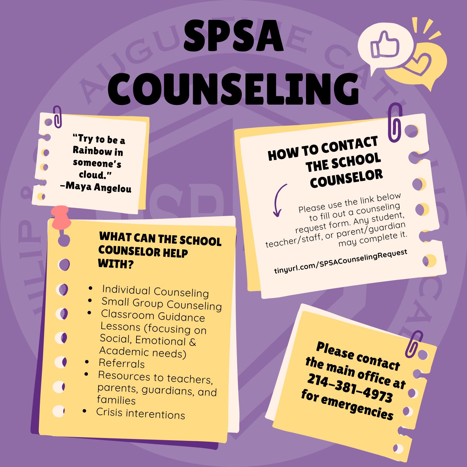 Welcome to Counselor’s Corner—a safe and welcoming space where students and families at St. Philip & St. Augustine Catholic Academy (SPSA) can find support, encouragement, and resources for personal growth and emotional well-being.